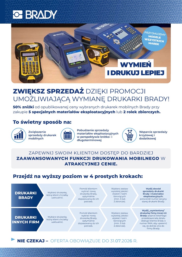 Jeszcze do końca lipca 2026 firma Brady proponuję promocyjną cenę 50% na nową drukarkę mobilną, pod następującymi warunkami: