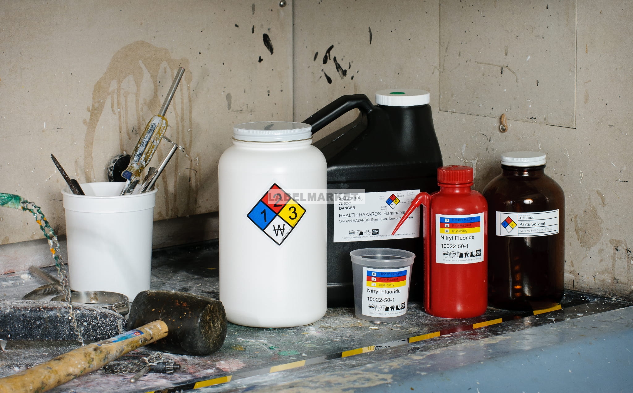 Etykiety do substancji chemicznych, zadrukowane, w ramach systemu informacji koniecznych (RTK) B-595