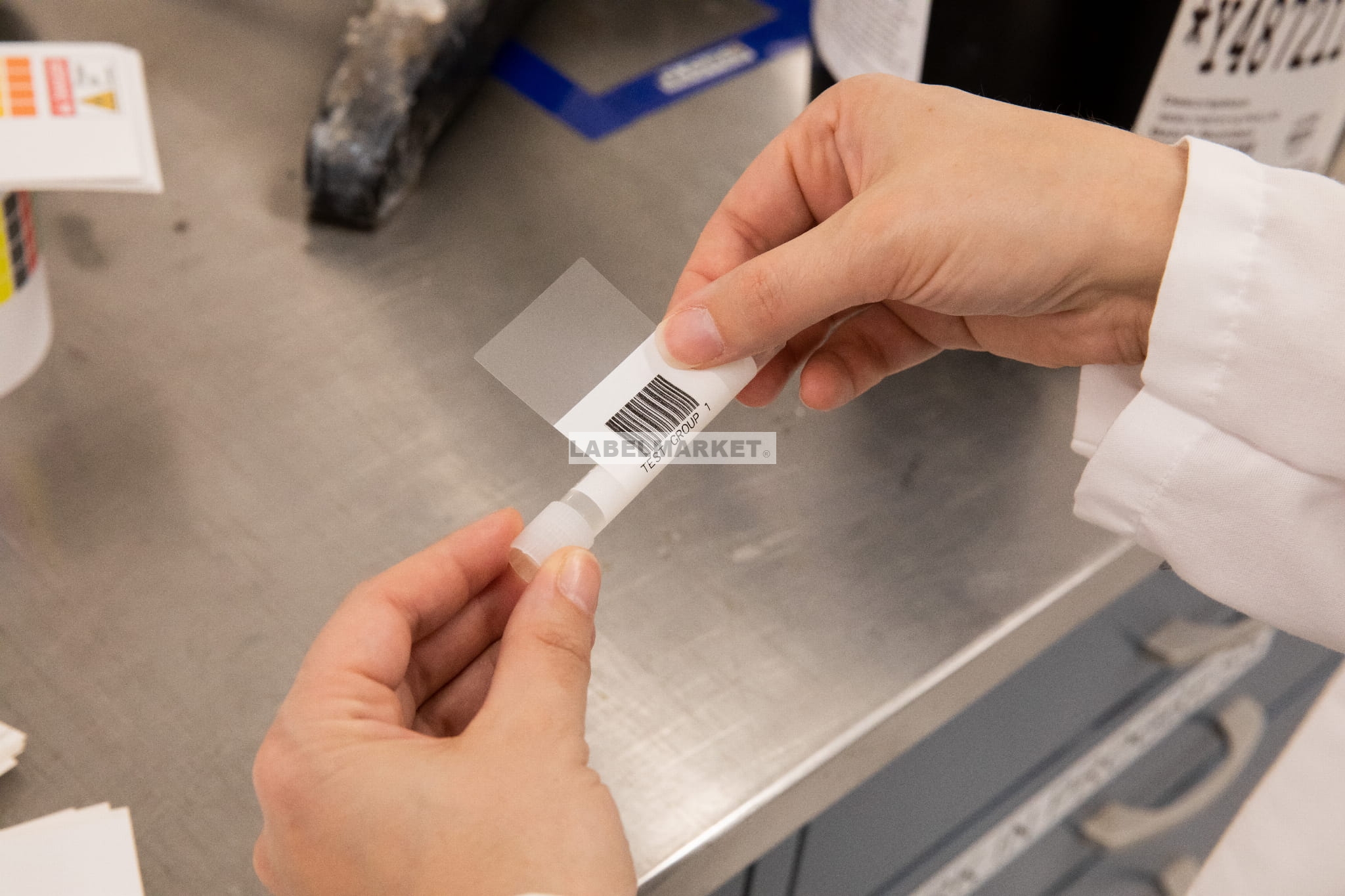Poliestrowa etykieta z białym obszarem do zadruku termicznego i przezroczystym paskiem samolaminującym. Doskonale nadaje się do zastosowań laboratoryjnych, odporna na ciekły azot i akutoklawowanie. Dobra odporność na ścieranie i działanie rozpuszczalników, możliwość używania do znakowania fiolek i probówek.