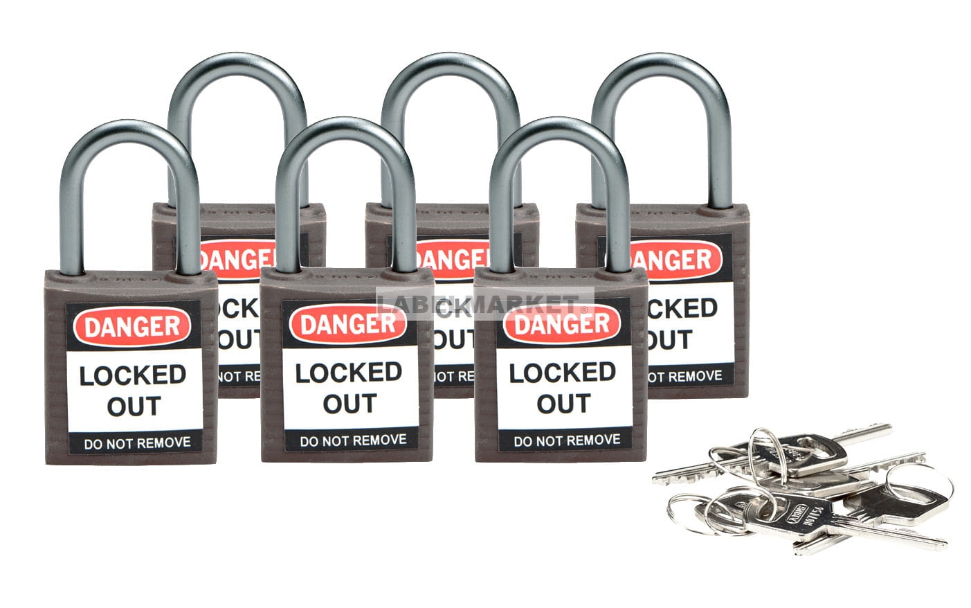 Brady kłódka tradycyjna nylonowa kompaktowa - szekla aluminiowa 25 mm różne klucze zestaw 6 szt. (814123)