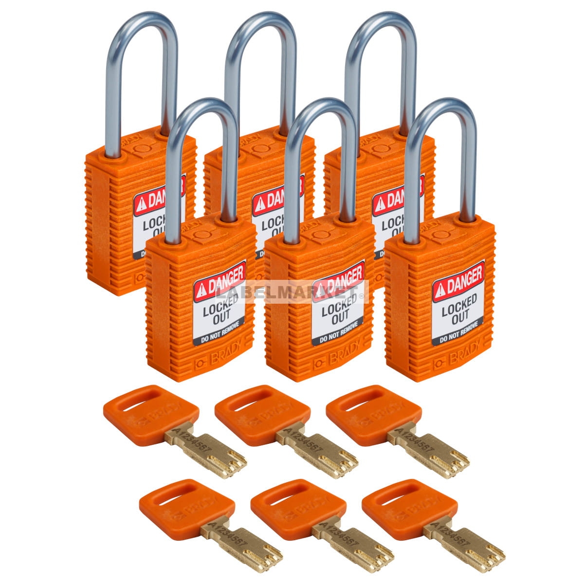 Kłódka SafeKey Nylon Compact Brady - szekla aluminiowa 38 mm różne klucze POMARAŃCZOWA zestaw 6 sztuk (151669)